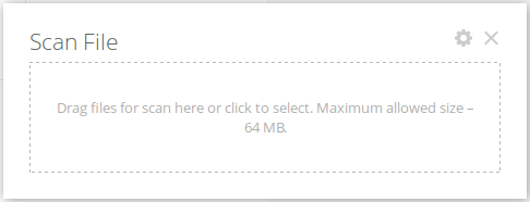 The web interface provides a capability to scan any files stored on your local computer (from which you are currently accessing the web interface) to determine whether the files have any malicious content, the scanning is done with the help of the scanning engine that is part of Dr.Web for UNIX. The files selected for scanning will be uploaded (via the HTTP protocol) to your server on which Dr.Web for UNIX is running, but after the scanning, even if any threats are found, the files will not be stored on the server, neither will they be moved to quarantine there. The user who sent the files to scan them will only be informed about the result of the scanning. Opening a panel to scan local files and setting parameters for the scanning You can select and upload the files that you want to scan via the scanning panel for local files which is displayed when you choose the Scan file item in the main menu of the web interface. The launched panel is displayed in the bottom right corner of the web interface. The figure below shows what the scanning panel for local files looks like.