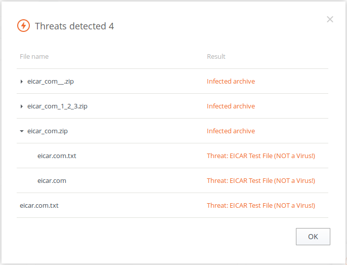 Figure 9. Extended report about the scanned local files To close the report and to return to the state where the panel allows selecting new files for scanning, press OK.