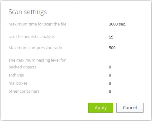 Figure 6. Setting the parameters for the scanning of local files To apply the changed settings and to return to the file selection mode where you can choose the files to scan, press the Apply button. To go back to file selection without applying your changes to the settings, press the Cancel button. Launching the scanning of local files To select files for scanning and to start their scanning, left-click on the target area that says Drag files for scan here or click to select. Upon your click there, a standard file selection window of your operation system’s file manager will open. You can choose multiple files at once for scanning. Please, note that you are not allowed to choose directories for scanning. You can also drag selected files with your mouse directly onto the target area of the file scanning panel from the file manager window. Once the files to be scanned have been specified, they will start being uploaded to your server where Dr.Web for UNIX is installed; and once a file is uploaded, its scanning starts. During the uploading and scanning of the files the file scanning panel displays the overall progress of the scanning procedure.